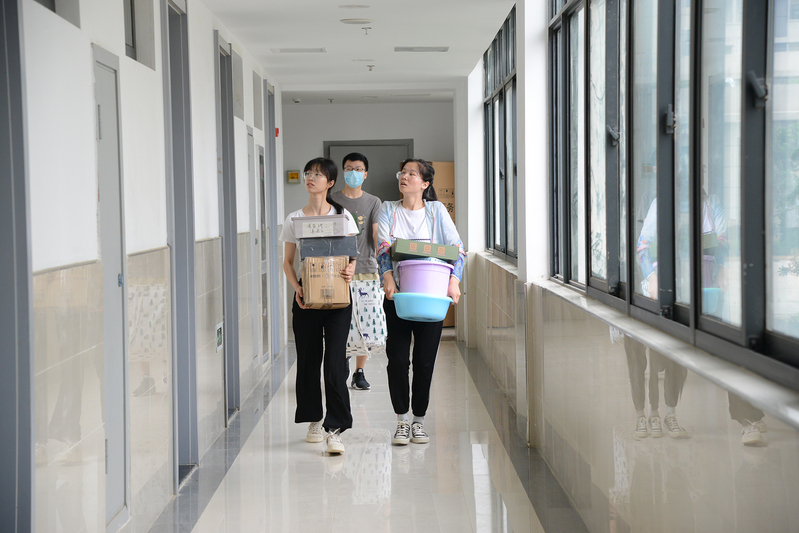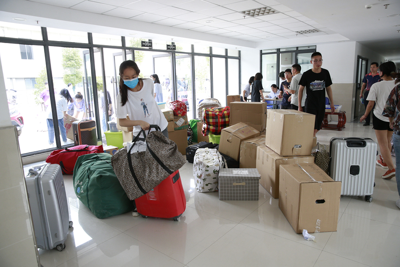 記者看到,在新校區47號、48號、50號樓,同學們在宿管處領取新宿舍鑰匙、登記相關信息、了解注意事項,搬運行李至宿舍,大家互幫互助,其樂融融。