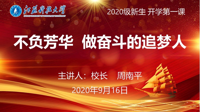我們每個人都是歲月中的匆匆過客,若不能搏擊風浪,人生便少了一分精彩。今年是學校從上海遷址鎮江辦學50周年,五十年風雨兼程,學校從新中國第一所造船中等專業學校發展壯大成為今天的江蘇科技大學,擁有本、碩、博完整的人才培養體系,3個博士后流動站、4個一級學科博士點,先后兩次獲得國家科技進步特等獎,3個學科進入ESI全球排名前1%,靠的是什么?靠的就是歷代江科大人胸懷夢想、一往無前的拼搏精神。今年上半年,在全體師生的拼搏進取中,我們打贏了疫情防控阻擊戰,順利完成了長山校區的搬遷啟用。同時,學校事業發展也取得了很多亮點。學校在江蘇省綜合考核中被列為第一等次,列入江蘇省高水平大學建設重點(培育)支持高校。綜合實力在第三方評價機構“2020軟科中國大學排名”位列全國第142位,2020年“軟科世界一流學科排名”船舶與海洋工程學科世界排名第14位。他滿含真情地說:“學校為了早日建成國內一流造船大學,真的是很拼的!同學們,你們將是學校高質量發展的見證人,同時也是實現自我夢想的追夢人,千萬不要讓你的夢想只是陪你過夜,它還需要把你早早叫醒。人生就是一場波浪式前進的旅程,希望你們不要把人生的巔峰定格在考上大學,而要帶著自己所學、師長所授,不斷登高望遠,和學校共同拼搏,修煉出‘吃得了苦、扎得下根、聚得齊心、干得成事’的江科大特質,以優異的成績從江科大C位出道。”