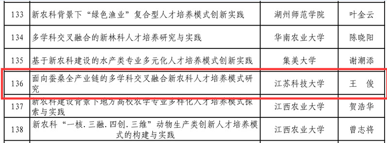 近日,教育部官網公布了《教育部辦公廳關于公布新農科研究與改革實踐項目的通知》(教高廳函〔2020〕20號),我校生物技術學院申報的“面向蠶桑全產業鏈的多學科交叉融合新農科人才培養模式研究”(項目主持人:王俊)成功獲批。