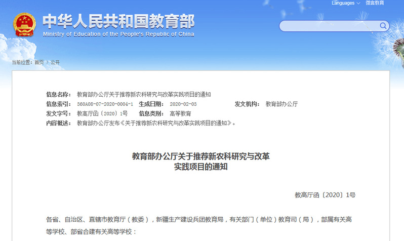 新農科研究與改革實踐項目是教育部深入貫徹落實習近平總書記給全國涉農高校書記校長和專家代表重要回信精神,引導高校以立德樹人為根本、以強農興農為己任,優化涉農專業結構,深化高等農林教育教學改革,加快培養知農愛農新型人才,深入推進“六卓越一拔尖”計劃2.0的重要舉措。在各地各高校擇優推薦的基礎上,經線上審核、會議審核及網上公示,教育部最終認定407個新農科研究與改革實踐項目。