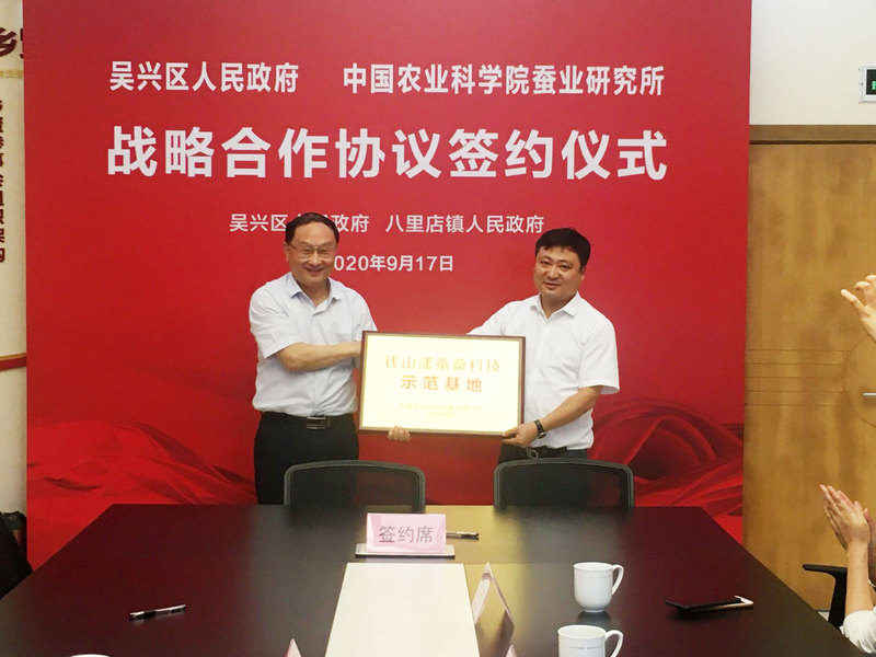 會上,李木旺所長代表蠶業研究所與地方領導簽訂了合作協議,鄭培鋼書記為“錢山漾蠶桑科技示范基地”授牌。