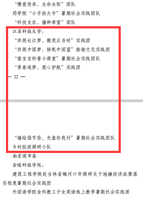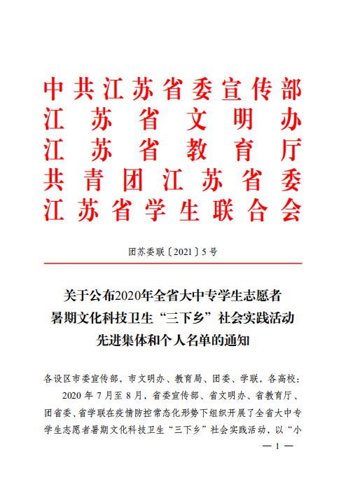 近日,中共江蘇省委宣傳部、江蘇省文明辦、江蘇省教育廳、共青團江蘇省委和江蘇省學生聯合會聯合下發了《關于公布2020年全省大中專學生志愿者暑期文化科技衛生“三下鄉”社會實踐活動先進集體和個人名單的通知》,我校在該活動中獲多項榮譽:江蘇科技大學團委榮獲“先進單位”稱號;“共筑長江夢,微笑正當時”實踐團等7支團隊榮獲“優秀團隊”稱號;蔡志尚等8位同學榮獲“先進個人”稱號;卜江春等6位老師榮獲“先進工作者”稱號;溧陽市戴埠中心小學榮獲“優秀社會實踐基地”稱號;《“喜迎建黨一百周年”暑期社會實踐活動》《扶貧先扶志,泗陽助夢行》榮獲“優秀調研報告”稱號。