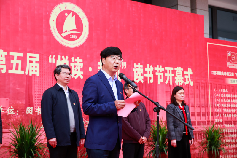 為慶祝中國共產黨成立100周年,引領師生誦讀百年黨史,傳承紅色經典,4月22日下午,在第26個“世界讀書日”到來之際,江蘇科技大學第五屆“悅讀·起航”讀書節開幕式暨黨史閱讀馬拉松挑戰賽啟動儀式在長山校區圖書館南門隆重舉行。校黨委副書記、副校長景旭文,校黨委常委、宣傳部長周春燕出席開幕式。學生處、工會、團委等職能部門負責人,圖書館全體館員、黨史閱讀馬拉松參賽選手、讀者協會會員以及師生代表一同參加了開幕式。開幕式由圖書館黨總支書記王明強主持。