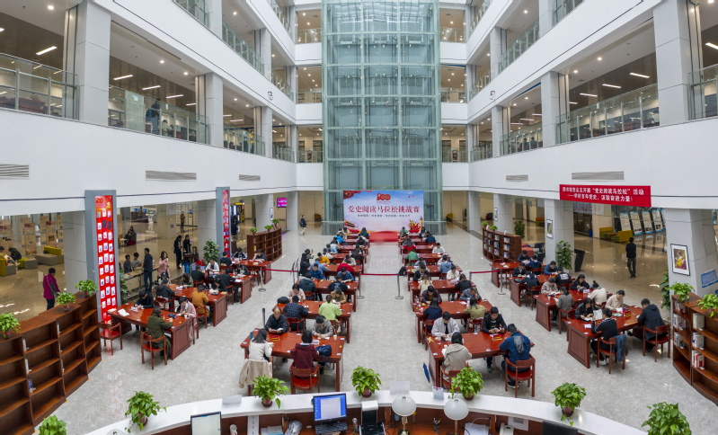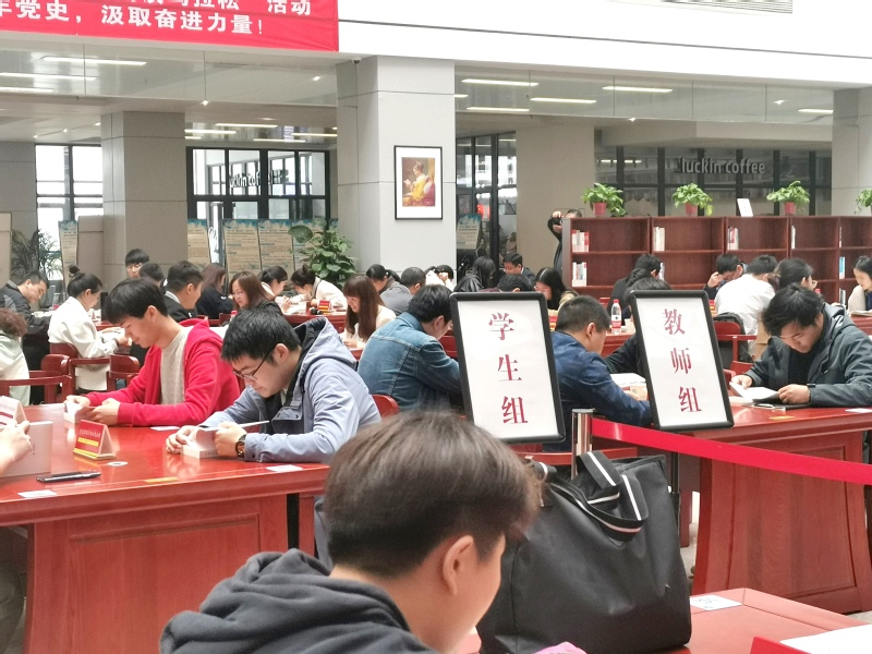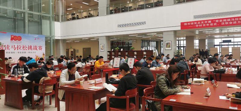 開幕式結束,黨史閱讀馬拉松挑戰賽正式拉開帷幕。比賽分教師團隊組和學生個人組,共100余名參賽選手在圖書館一樓大廳就坐,共赴一場閱讀盛會。