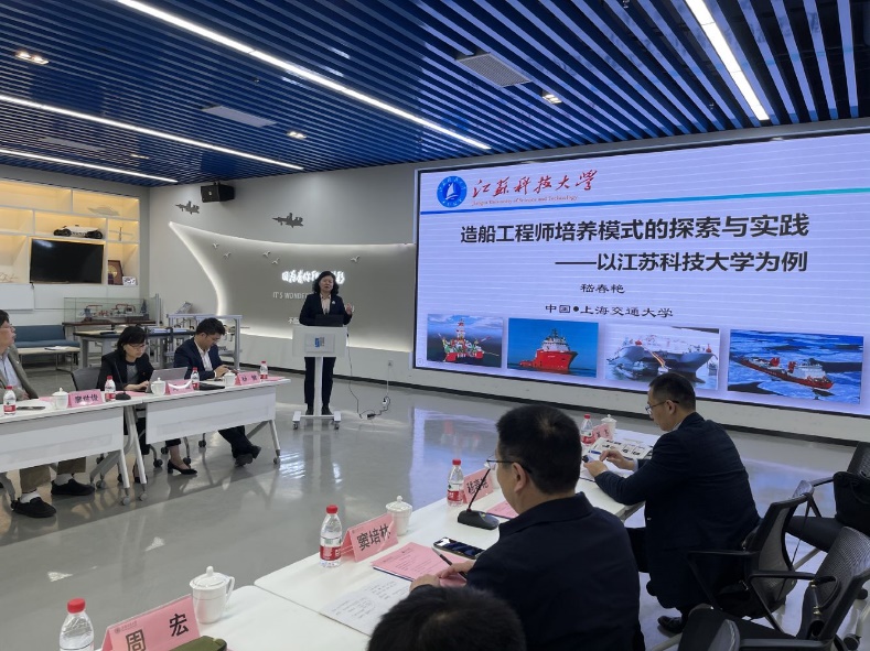 在上海交通大學船舶海洋與建筑工程學院,嵇春艷副校長一行受到了院長廖世俊、黨委書記周薇、教學顧問高捷、副院長楊健、薛鴻祥等熱情接待。在參觀了船舶與海洋工程協同設計中心后,嵇春艷副校長做了《造船工程師培養模式的改革與實踐—以江蘇科技大學為例》的主題報告,廖世俊院長對我校“五十載初心不變,做造船工程師的搖籃”表示贊賞。