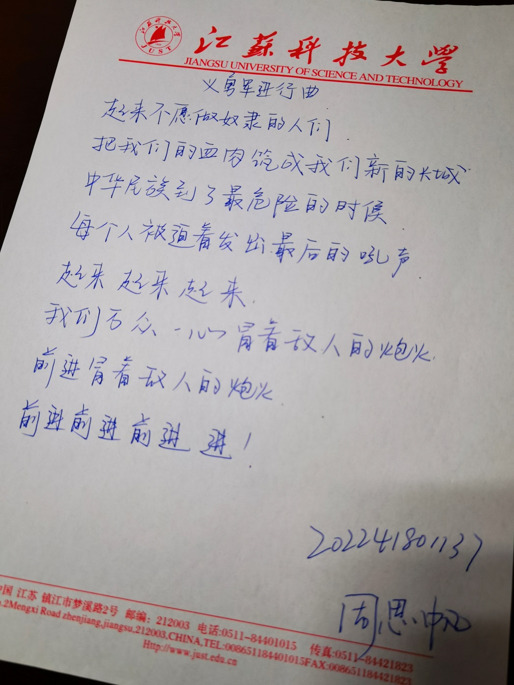 在默寫國歌歌詞中,個別同學將“做奴隸”寫成“作奴隸”,“新的長城”寫成了“心的長城”,“每個人被迫著發出”寫成“每個人們被迫發出”等。對此,海洋工程類張同學自我反思道:沒有信心一字不錯地默對,突然默寫的時候感覺腦子一片空白,但是想起伴奏,就能一字不差的唱出來。材料類段同學坦誠表示:沒有默寫前很有信心,實際寫在紙上時突然有些不確定。默寫和唱出來是完全不一樣的感覺,默寫給人以深沉。