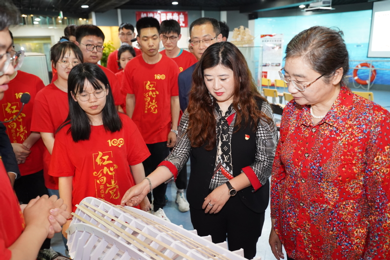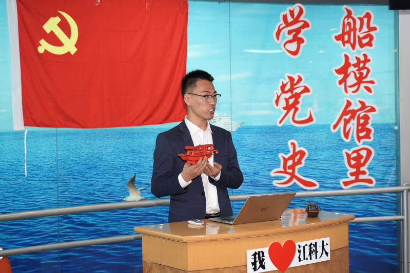 小小紅船劃出新中國,巍巍巨輪航向新征程。在船舶模型館,來自船海學(xué)院景榮春黨支部的大學(xué)生開展了一場別開生面的黨史學(xué)習(xí)。“我手上拿的這艘小船就是當(dāng)年承載著平均年齡28歲的中中共一大代表們的紅船的模型,在這里我要感謝陳宇同學(xué)和徐帆同學(xué),為了能夠有一艘模型可以展示,他們自己設(shè)計、切割、拼裝,用自己所學(xué)專業(yè)知識完美復(fù)刻了當(dāng)年那艘偉大的小船。”景榮春黨支部書記夏志平拿出同學(xué)們親手設(shè)計制作的紅船,邀請馬克思主義學(xué)院的李樹文老師深入闡述“紅船精神”,講述“小船托起大黨”的故事。