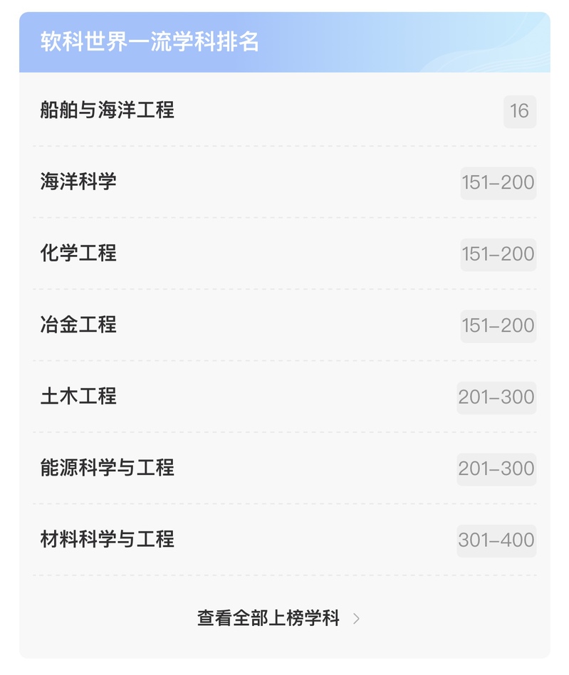 5月26日,上海軟科(ShanghaiRanking's Global Ranking of Academic Subjects)發布“2021軟科世界一流學科排名”,江蘇科技大學7個學科進入排行榜,較2020年增加1個學科,入選學科為船舶與海洋工程、海洋科學、化學工程、冶金工程、土木工程、能源科學與工程、材料科學與工程。其中,船舶與海洋工程學科排名位列全國第9位,世界第16位;海洋科學學科、化學工程學科、冶金工程學科分別位列世界151-200位;土木工程、能源科學與工程學科進入世界201-300位;材料科學與工程學科位列世界301-400位。海洋科學學科首次入選軟科世界一流學科排行榜,進一步彰顯了我校的辦學特色。