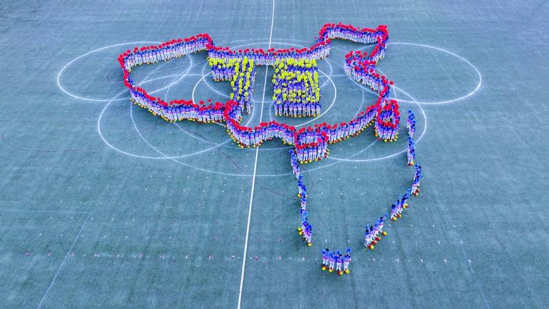“砥礪前行七十五載,共繪祖國時代新篇!”,來自材料科學與工程學院的500余名學生帶來了“奔跑吧,江科大”團體操表演。綠茵場上,同學們用不同顏色繪制出校徽的船帆圖案,表達了大家對學校繼往開來、大展宏圖的祝福。大家手拉手,心連心,從四面八方迅速聚攏,如同星星點點匯聚成光海一片,以不可阻擋之勢匯聚成一幅壯麗的祖國圖案,那是對偉大祖國的深情禮贊。每一代江科大人,都無畏前行,大家綻放的生命之花,永遠挺立在家國的枝頭!