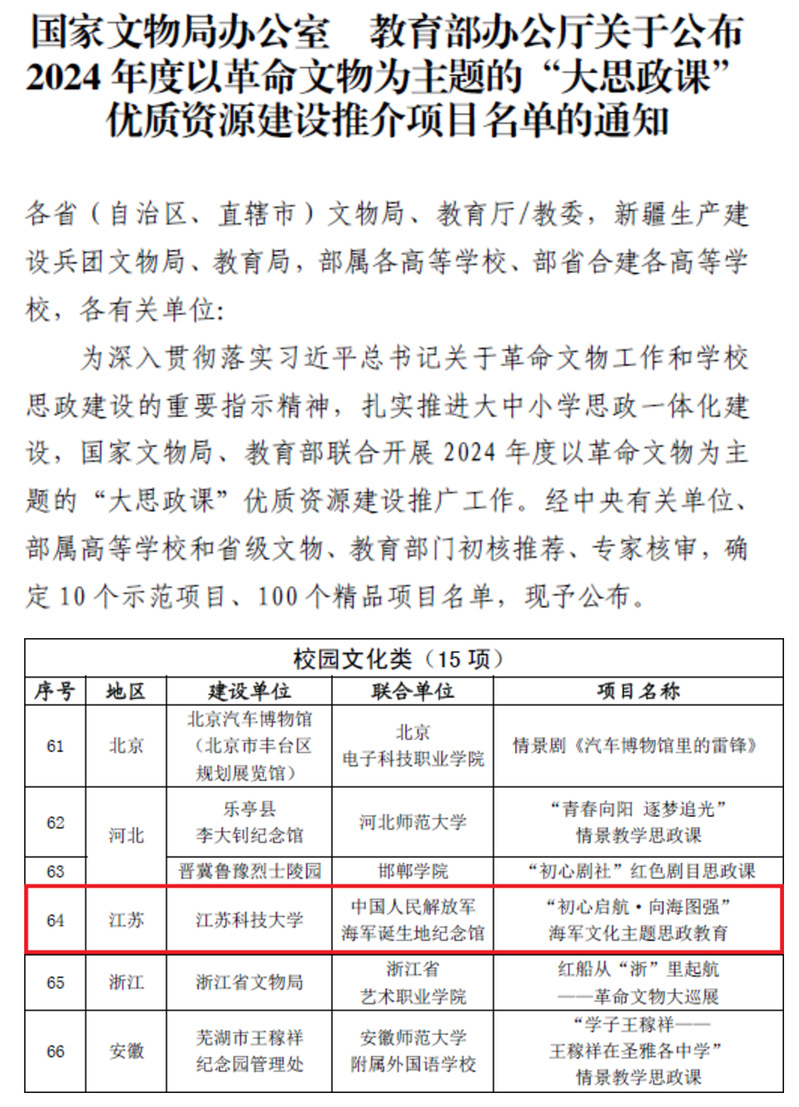 近日,由國家文物局和教育部聯(lián)合開展的2024年度以革命文物為主題的“大思政課”優(yōu)質(zhì)資源建設(shè)推介活動公布結(jié)果,經(jīng)中央有關(guān)單位、部屬高等學(xué)校和省級文物、教育部門初核推薦、專家核審,在全國范圍內(nèi)遴選了10個示范項目和100個精品項目,其中江蘇省獲批6項精品項目。由我校聯(lián)合中國人民解放軍海軍誕生地紀(jì)念館(海紀(jì)館)共同建設(shè)的“初心啟航?向海圖強”海軍文化主題思政教育入選校園文化類精品項目,這也是我省獲得的唯一一項校園文化類精品項目。