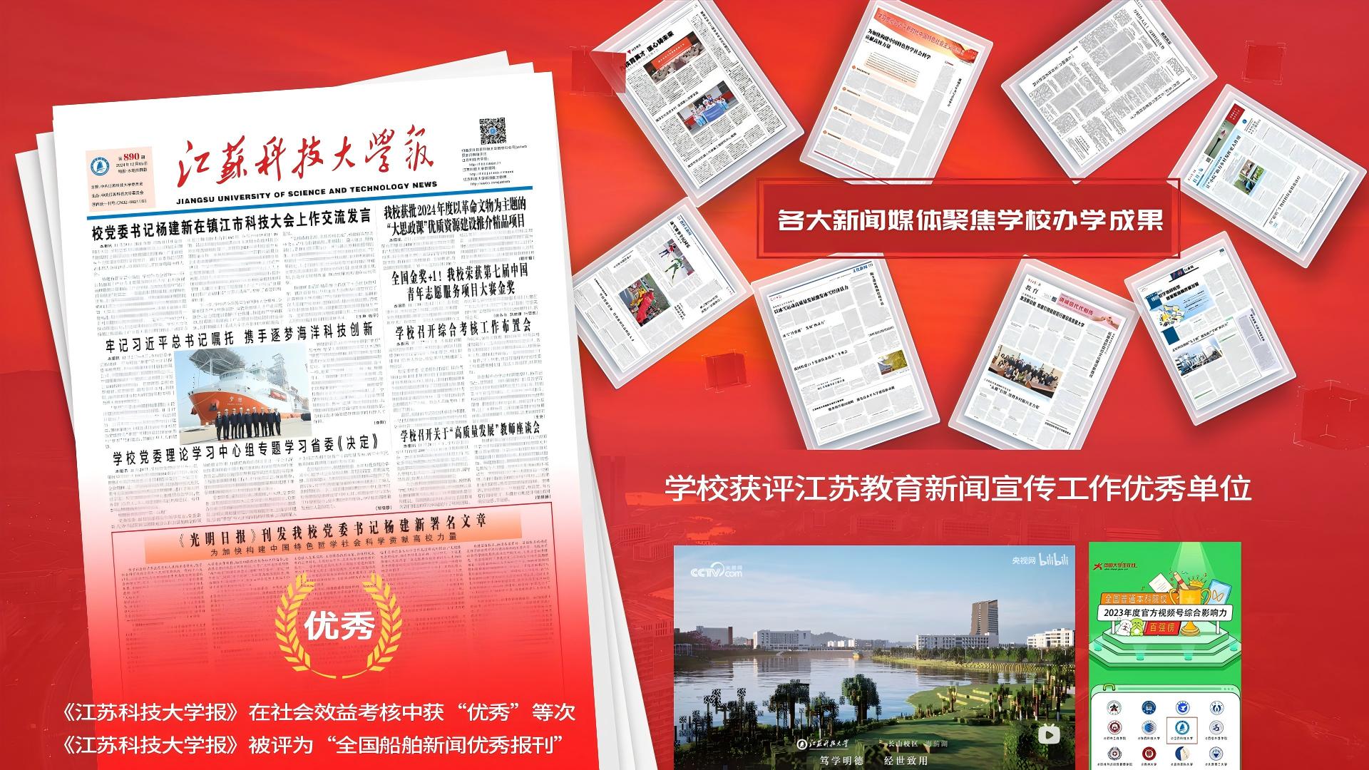 堅(jiān)持黨管意識(shí)形態(tài)、黨管宣傳,學(xué)校文化軟實(shí)力全面提升。2024年,學(xué)校獲評(píng)江蘇教育新聞宣傳工作優(yōu)秀單位。官網(wǎng)新開(kāi)設(shè)《遇見(jiàn)江科大》《老師,您好》《奮進(jìn)新航程》等12個(gè)專(zhuān)欄共51期。《江蘇科技大學(xué)報(bào)》在社會(huì)效益考核中獲“優(yōu)秀”等次,獲評(píng)“船舶新聞優(yōu)秀報(bào)刊獎(jiǎng)”。中央電視臺(tái)、人民日?qǐng)?bào)、光明日?qǐng)?bào)、新華社、中國(guó)日?qǐng)?bào)、中國(guó)教育報(bào)、中國(guó)船舶報(bào)等主流媒體聚焦學(xué)校辦學(xué)成果,深度報(bào)道學(xué)校高質(zhì)量發(fā)展實(shí)踐。逐夢(mèng)深藍(lán)的“輪椅男孩”陳帆、徒步“特種兵”陳楚琰,自制單片機(jī)網(wǎng)課播放量超2000萬(wàn)人次的黃國(guó)棟等學(xué)生典型被新華日?qǐng)?bào)、江蘇教育報(bào)、揚(yáng)子晚報(bào)等媒體深度報(bào)道。學(xué)校新媒體矩陣粉絲量30w+,官方微信瀏覽量297w+,微博瀏覽量660W+,抖音播放量1762W+,視頻號(hào)播放量219W+,1件作品榮獲第七屆全國(guó)大學(xué)生網(wǎng)絡(luò)文化節(jié)優(yōu)秀推薦作品,18件作品獲第三屆江蘇省大學(xué)生網(wǎng)絡(luò)文化節(jié)獎(jiǎng)項(xiàng)。視頻號(hào)上榜年度全國(guó)高校官方視頻號(hào)綜合影響力百?gòu)?qiáng)榜單;獲評(píng)中國(guó)大學(xué)生在線(xiàn)“優(yōu)秀校園網(wǎng)絡(luò)通訊站”,作品《辦學(xué)90周年系列報(bào)道》獲評(píng)中青網(wǎng)年度優(yōu)秀校園新聞專(zhuān)題;入選B站2024年度寶藏大學(xué),與央視網(wǎng)共創(chuàng)《我的大學(xué)超酷》播放量超百萬(wàn)。