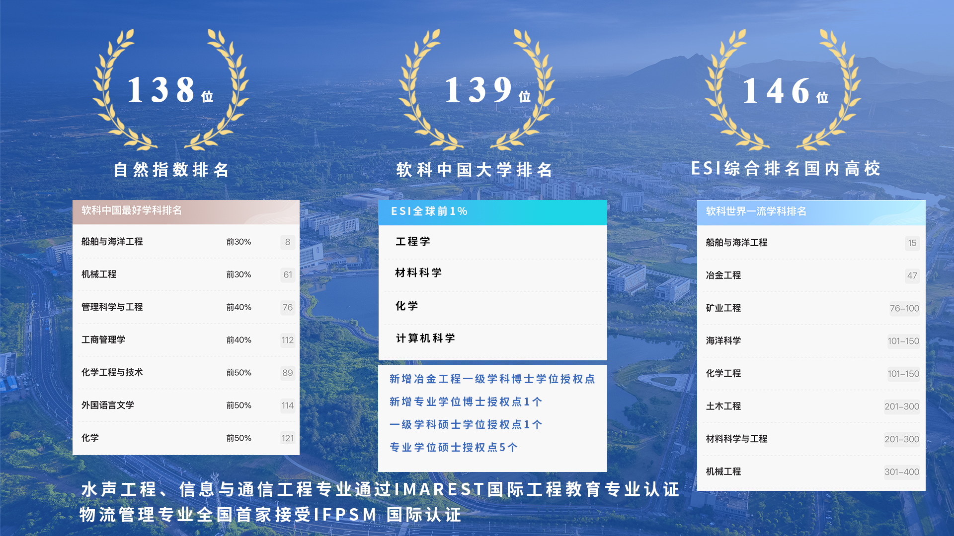 學(xué)校呈現(xiàn)多學(xué)科協(xié)調(diào)發(fā)展的新格局,突出優(yōu)勢(shì)、強(qiáng)化特色、內(nèi)涵發(fā)展。在2024年第三方評(píng)價(jià)機(jī)構(gòu)軟科中國(guó)大學(xué)排名139位,ESI綜合排名國(guó)內(nèi)高校第146位,自然指數(shù)排名138位,工程學(xué)、材料科學(xué)、化學(xué)、計(jì)算機(jī)科學(xué)4個(gè)學(xué)科進(jìn)入ESI全球前1%。新增冶金工程一級(jí)學(xué)科博士學(xué)位授權(quán)點(diǎn),填補(bǔ)江蘇高校該學(xué)科博士點(diǎn)空白;新增專(zhuān)業(yè)學(xué)位博士授權(quán)點(diǎn)1個(gè),一級(jí)學(xué)科碩士學(xué)位授權(quán)點(diǎn)1個(gè),專(zhuān)業(yè)學(xué)位碩士授權(quán)點(diǎn)5個(gè)。獲批教育部學(xué)位與研究生教育發(fā)展中心、中國(guó)專(zhuān)業(yè)學(xué)位案例中心年度主題案例5項(xiàng),立項(xiàng)數(shù)量全省并列第一。水聲工程、信息與通信工程專(zhuān)業(yè)通過(guò)IMarEST國(guó)際工程教育專(zhuān)業(yè)認(rèn)證,標(biāo)志著我校水聲工程、信息與通信工程專(zhuān)業(yè)的人才培養(yǎng)體系與國(guó)際標(biāo)準(zhǔn)接軌。召開(kāi)管理科學(xué)與工程學(xué)位授權(quán)點(diǎn)周期性合格評(píng)估專(zhuān)家評(píng)審會(huì),學(xué)校物流管理專(zhuān)業(yè)全國(guó)首家接受IFPSM 國(guó)際認(rèn)證。