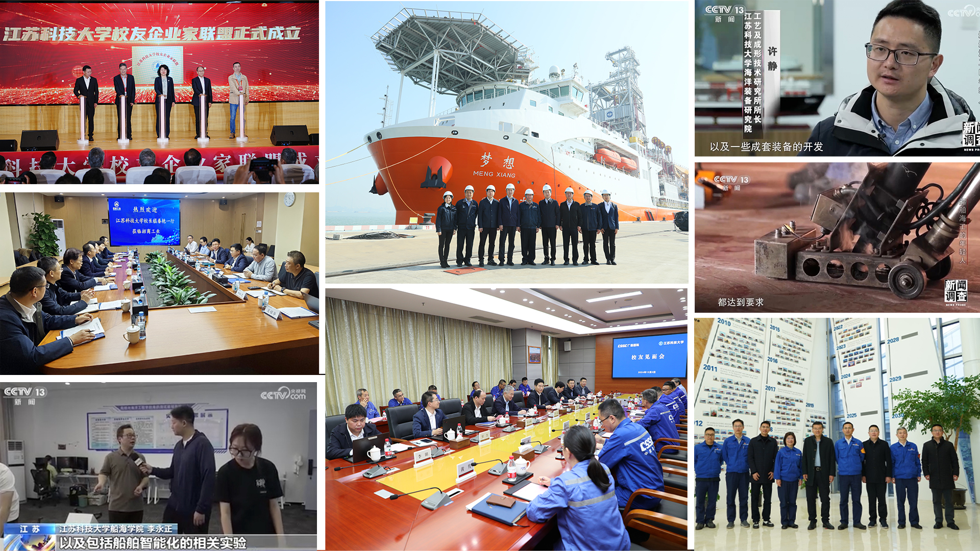 學(xué)校聚智領(lǐng)航,積極為推動(dòng)實(shí)現(xiàn)高水平科技自立自強(qiáng)貢獻(xiàn)江科大力量。黨委書(shū)記楊建新帶隊(duì)專(zhuān)程赴眾多校友參與設(shè)計(jì)建造的“夢(mèng)想”號(hào)大洋鉆探船實(shí)地考察,深化校企合作,攜手逐夢(mèng)海洋科技創(chuàng)新。校長(zhǎng)嵇春艷率隊(duì)赴深圳招商局工業(yè)集團(tuán)考察交流,推進(jìn)科技成果轉(zhuǎn)化。中央電視臺(tái)新聞?wù){(diào)查欄目《船舶海工的年輕人》專(zhuān)題報(bào)道學(xué)校科研成果助力國(guó)產(chǎn)大型郵輪建造,央視新聞《校企聯(lián)合,生“才”有道》報(bào)道學(xué)校為企業(yè)輸送高素質(zhì)技術(shù)人才。打造校地企合作的有效載體,成立校友企業(yè)家聯(lián)盟,獲批江蘇省科技創(chuàng)新智庫(kù)基地、江蘇省卓越工程師學(xué)院,為新質(zhì)生產(chǎn)力發(fā)展注入新動(dòng)能。加快推進(jìn)教育科技人才融合發(fā)展,與中船黃埔文沖船舶有限公司、中國(guó)船舶集團(tuán)廣船國(guó)際有限公司、中國(guó)船舶集團(tuán)廣州船舶工業(yè)有限公司簽署全面戰(zhàn)略合作協(xié)議,與上海外高橋造船有限公司、上海船舶工藝研究所、中國(guó)船舶集團(tuán)第七一二研究所簽署戰(zhàn)略合作協(xié)議。
