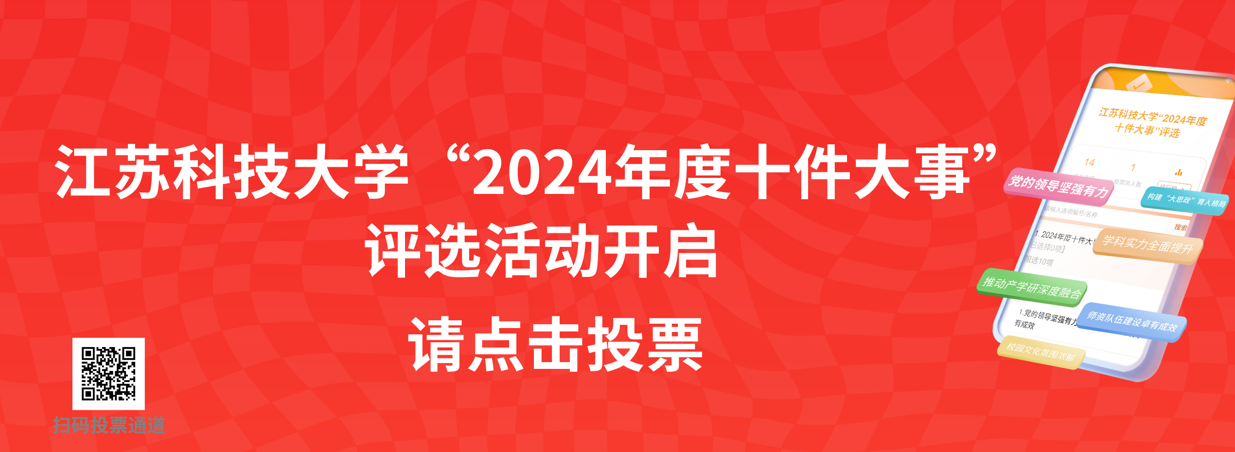 新歲將啟,征途日進(jìn)。校園十件大事票選全面啟動(dòng)!2024年,全體江科大人在校黨委、行政的堅(jiān)強(qiáng)領(lǐng)導(dǎo)下唱響奮進(jìn)之歌,深情獻(xiàn)禮新中國(guó)成立75周年;振開(kāi)局之勢(shì),落實(shí)學(xué)校第四次黨代會(huì)精神;抓關(guān)鍵之為,向?qū)崿F(xiàn)“十四五”規(guī)劃和高水平大學(xué)建設(shè)高峰計(jì)劃目標(biāo)砥礪前行,學(xué)校各項(xiàng)事業(yè)發(fā)展取得可喜成績(jī)。作為學(xué)校發(fā)展大事的見(jiàn)證者、參與者,現(xiàn)誠(chéng)摯歡迎廣大師生校友積極參與“2024年度十件大事”票選。