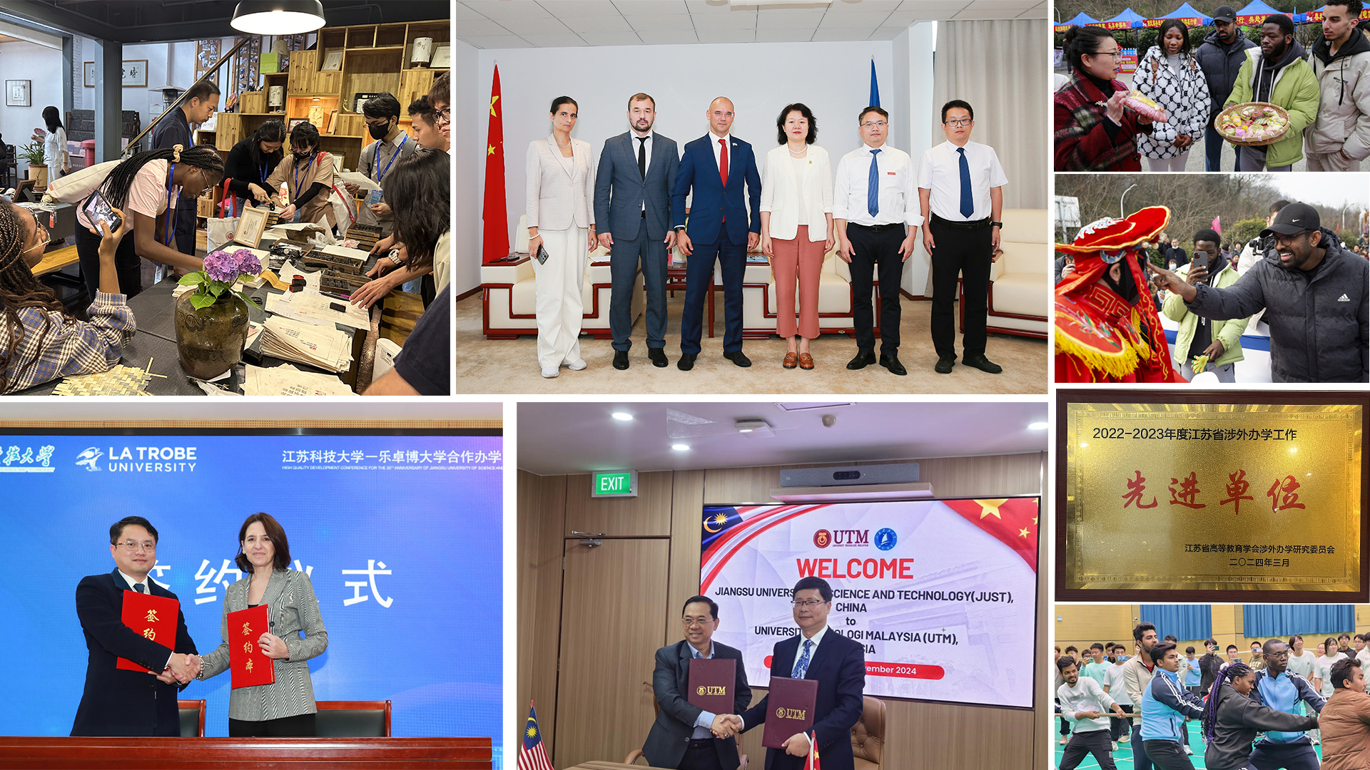 持續(xù)深化國(guó)際友誼與合作,校領(lǐng)導(dǎo)率團(tuán)赴馬來(lái)西亞、柬埔寨訪(fǎng)問(wèn)交流,學(xué)校首次與東南亞相關(guān)大學(xué)簽署合作文件,受到出訪(fǎng)國(guó)政府邀請(qǐng)參加國(guó)事活動(dòng),國(guó)際影響力有力提升。舉辦江蘇科技大學(xué)-樂(lè)卓博大學(xué)合作辦學(xué)20周年發(fā)展大會(huì),聚力打造具有國(guó)際競(jìng)爭(zhēng)力的中外合作辦學(xué)優(yōu)勢(shì)品牌。俄羅斯奧加遼夫莫爾多瓦國(guó)立大學(xué)校長(zhǎng)、英國(guó)思克萊德大學(xué)副校長(zhǎng)帶隊(duì)來(lái)校訪(fǎng)問(wèn);俄羅斯伊爾庫(kù)茨克國(guó)立大學(xué)代表團(tuán)、荷蘭綠色智慧航運(yùn)代表團(tuán)、泰國(guó)高等教育科研創(chuàng)新部蠶桑教育科技代表團(tuán)來(lái)校開(kāi)展交流;澳大利亞莫道克大學(xué)與學(xué)校簽署校際合作備忘錄。增強(qiáng)留學(xué)生教育管理,設(shè)置“開(kāi)學(xué)第一課”為留學(xué)生筑夢(mèng)中國(guó)保駕護(hù)航,組織留學(xué)生開(kāi)展中國(guó)民俗體驗(yàn)活動(dòng),鼓勵(lì)留學(xué)生講好中國(guó)故事。1名教師在江蘇高校外國(guó)留學(xué)生教學(xué)觀摩比賽中獲一等獎(jiǎng)。新華日?qǐng)?bào)《科技澆灌友誼樹(shù),架起中非“同心橋”》報(bào)道我校留學(xué)生學(xué)成歸國(guó)助力家鄉(xiāng)發(fā)展案例。學(xué)校榮獲 “江蘇省涉外辦學(xué)工作先進(jìn)單位”稱(chēng)號(hào)。