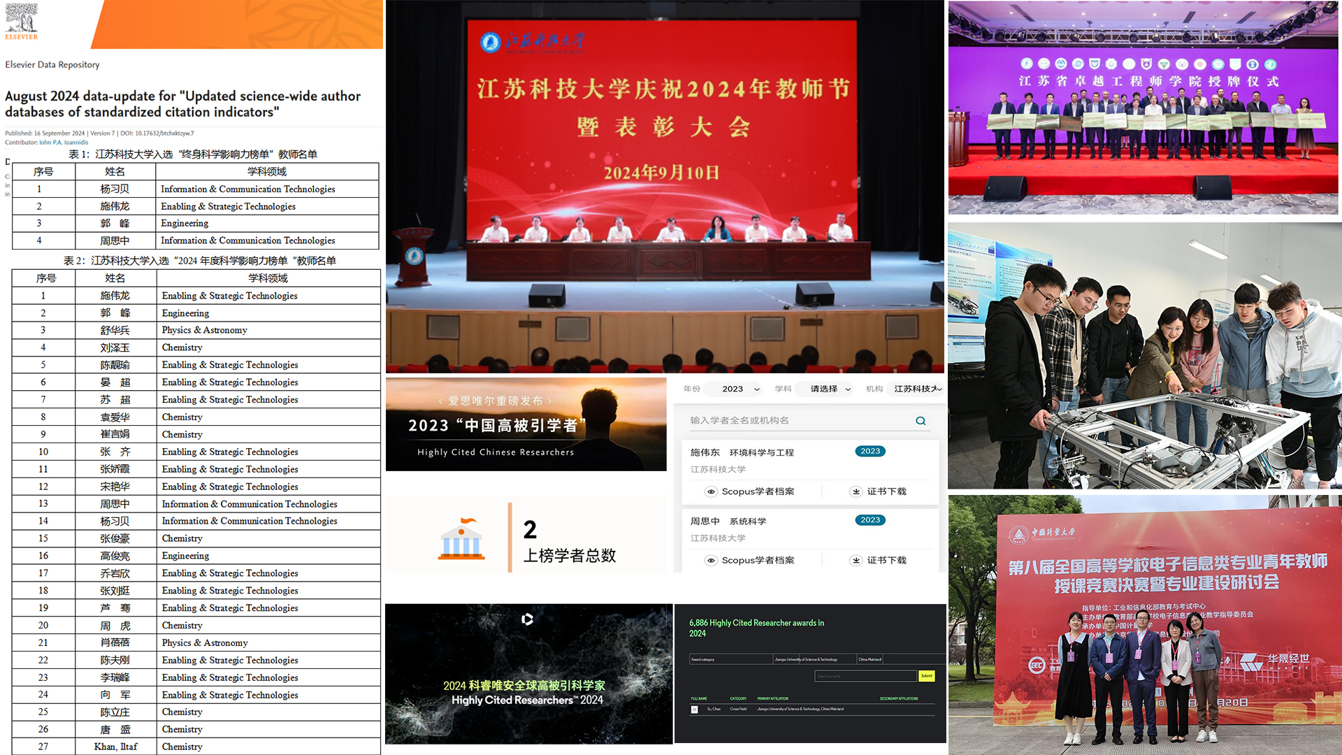 學(xué)校建強(qiáng)師資隊(duì)伍,在第40個(gè)教師節(jié)到來(lái)之時(shí),召開(kāi)慶祝2024年教師節(jié)暨表彰大會(huì),激勵(lì)全體教職工投身教育強(qiáng)國(guó)建設(shè),1名教師獲評(píng)全國(guó)優(yōu)秀教師。高層次人才引育并舉,召開(kāi)海外引才工作小組會(huì)議,開(kāi)展海外人才座談會(huì),營(yíng)造高層次人才快速成長(zhǎng)良好氛圍。27位學(xué)者入選2024年全球前2%頂尖科學(xué)家榜單,1人榮登 2024年度“全球高被引科學(xué)家榜單 ”,2人入選愛(ài)思唯爾2023“中國(guó)高被引學(xué)者”榜單。在第四屆全國(guó)高校教師教學(xué)創(chuàng)新大賽中,我校推薦省賽的教師團(tuán)隊(duì)全部獲獎(jiǎng),其中獲省賽特等獎(jiǎng)4項(xiàng)(含新教師賽道特等獎(jiǎng)),學(xué)校獲省賽優(yōu)秀組織獎(jiǎng);在國(guó)賽中,兩支團(tuán)隊(duì)勇奪全國(guó)一等獎(jiǎng),實(shí)現(xiàn)歷史性突破;我校“四維驅(qū)動(dòng),聚力打造卓越本科教學(xué)”案例也成功入選江蘇省高校教師教學(xué)發(fā)展典型案例;1名教師獲第8屆全國(guó)高等學(xué)校電子信息類(lèi)專(zhuān)業(yè)青年教師授課競(jìng)賽全國(guó)一等獎(jiǎng)。九三學(xué)社江科大委員會(huì)2名社員分別被表彰為社會(huì)服務(wù)先進(jìn)個(gè)人和全國(guó)宣傳思想工作先進(jìn)個(gè)人。