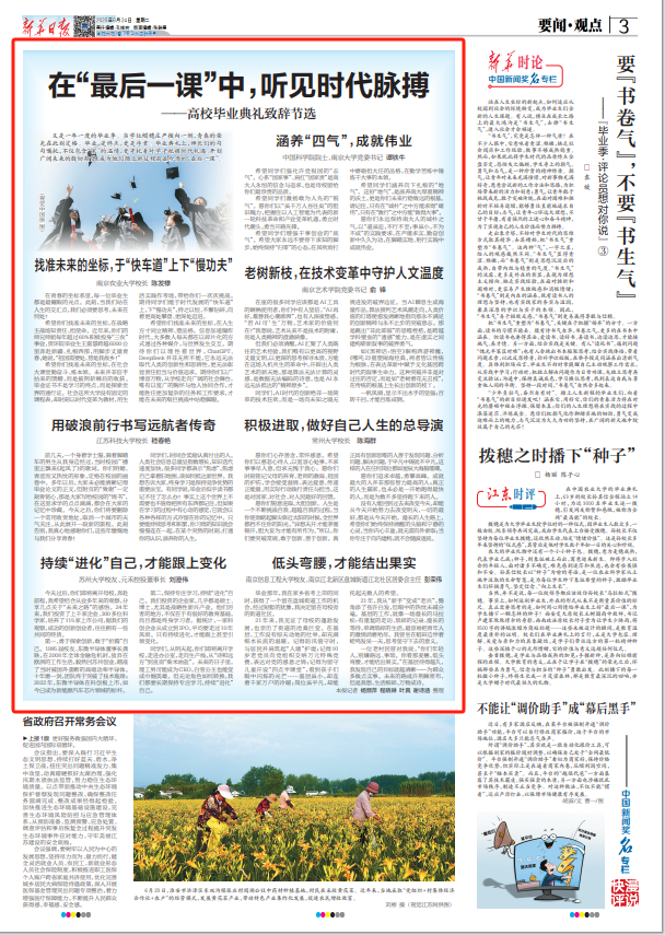 前幾天,一個身著學士服、騎著腳踏車的男生從我身邊經過,當時校園廣播里正飄來《起風了》的歌詞。你們明媚、青澀而又熱忱的形象,定格在校園的畫卷中。多年以后,大家未必能清晰記得畢業論文的正文,但附頁的“致謝”一定刻骨銘心,那是大家寫給校園的“情書”,在這里求學的點點滴滴,都會在大家的記憶中珍藏。今天之后,你們將要刪除一個常用收貨地址,取消一個城市的天氣關注,從此展開一段新的旅程。此刻告別,我真心地感謝你們,這些年慷慨地與我們分享青春!