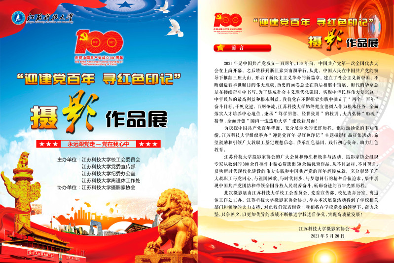 為慶祝中國共產黨百年華誕,充分展示黨的光輝歷程,謳歌頌揚黨的豐功偉績,江蘇科技大學組織舉辦“迎建黨100周年 尋紅色印記”主題攝影作品征集活動,希望激勵和引領廣大教職工堅定理想信念,傳承紅色基因,踐行初心使命,助力紅色教育。