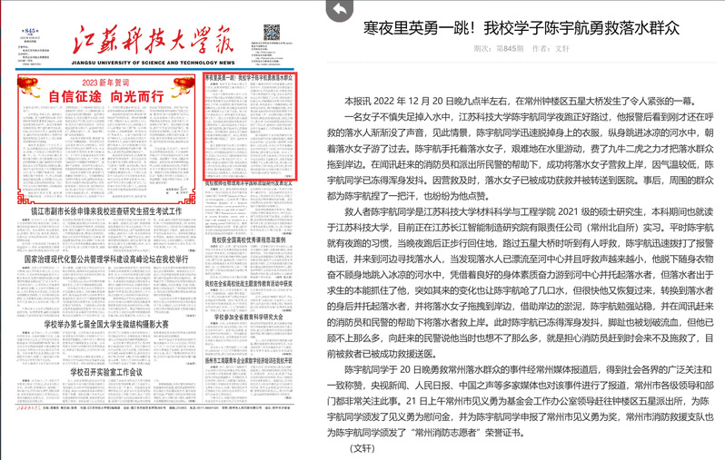 《江蘇科技大學(xué)報》作品《寒夜里英勇一跳!我校學(xué)子陳宇航勇救落水群眾》(作者:文軒;責(zé)編:李巍男)獲文字類二等獎;《江蘇科技大學(xué)報》作品《是退役士兵也是抗疫新兵 “老兵防疫特別行動小組”志愿守護“疫”線》(作者:萬旻、謝凌燕、周珂;責(zé)編:李巍男)獲文字類三等獎;《江蘇科技大學(xué)報》作品《從小竹筏到大輪船》(作者:楊金龍;責(zé)編:李巍男)獲副刊類三等獎;江蘇科技大學(xué)微信公眾號作品《江科大,是……?》(作者:陶淑琴、李沐軒;責(zé)編:王文強、羅文)獲三等獎;江蘇科技大學(xué)微博、抖音、快手、視頻號等新媒體作品《盛世華誕,共唱美麗中國!》(作者:張薯云、繆紅銘、常宇航、李家賢、許錚、徐榮晨;責(zé)編:王文強)獲三等獎。