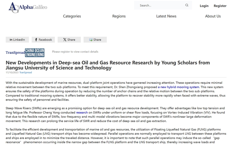 在江蘇科技大學慶祝辦學90周年之際,學校在深海油氣資源開發研究中取得新進展,迎來又一波海內外廣泛關注。中國第一本海洋工程領域SCI期刊China Ocean Engineering(中國海洋工程)發表江蘇科技大學深海油氣資源開發研究新進展的學術新聞(受中國科協卓越計劃資助),介紹了該校程勇教授、高俊亮教授等青年學者,在深海復雜環境條件下油氣生產、運輸設備的設計和操作性能方面的研究進展。報道發布后受到廣泛關注,被優睿科、美聯社等多家媒體轉發。