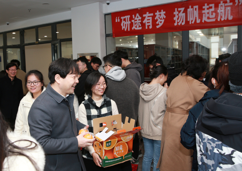 接著,校領(lǐng)導(dǎo)一行來(lái)到自習(xí)教室,為仍在潛心復(fù)習(xí)應(yīng)考的同學(xué)們送上橙子、旺仔牛奶和禮盒等慰問(wèn)品,祝同學(xué)們“橙”心如意,一戰(zhàn)成碩!