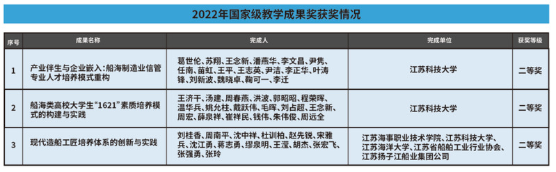 7月24日,教育部公布《2022年國家級教學(xué)成果獎獲獎項(xiàng)目名單》。江蘇科技大學(xué)《產(chǎn)業(yè)伴生與企業(yè)嵌入:船海制造業(yè)信管專業(yè)人才培養(yǎng)模式重構(gòu)》《船海類高校大學(xué)生“1621”素質(zhì)培養(yǎng)模式的構(gòu)建與實(shí)踐》等2項(xiàng)成果獲高等教育(本科)國家級教學(xué)成果獎二等獎,學(xué)校作為第二完成單位參與的成果《現(xiàn)代造船工匠培養(yǎng)體系的創(chuàng)新與實(shí)踐》獲職業(yè)教育國家級教學(xué)成果獎二等獎。實(shí)現(xiàn)學(xué)校國家級教學(xué)成果獎歷史性突破,激勵廣大教師投身教學(xué)研究與實(shí)踐,進(jìn)一步深化教育教學(xué)綜合改革。
