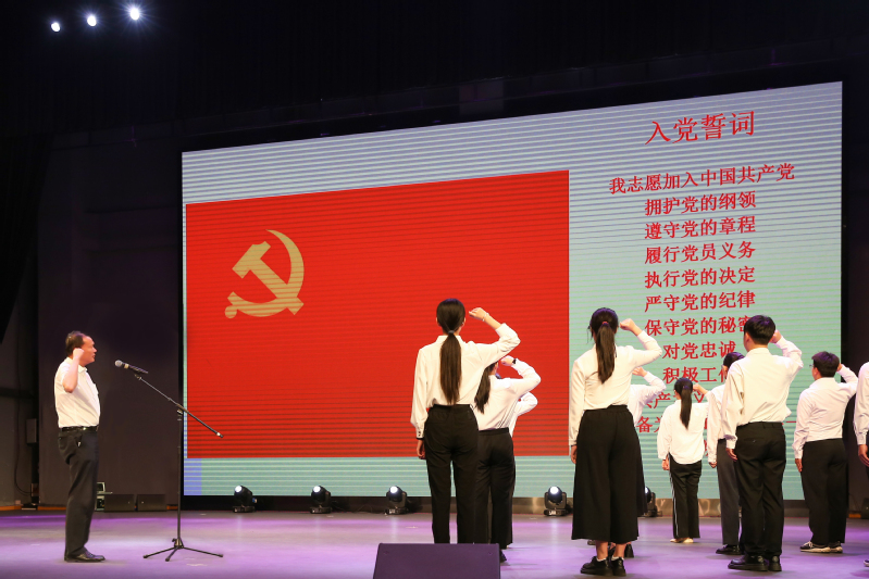 黨委副書記湯建帶領全體畢業生黨員重溫入黨誓詞。黨員同志面向黨旗莊嚴宣誓,在錚錚誓言中重溫入黨初心,堅定理想信念,牢記初心使命。