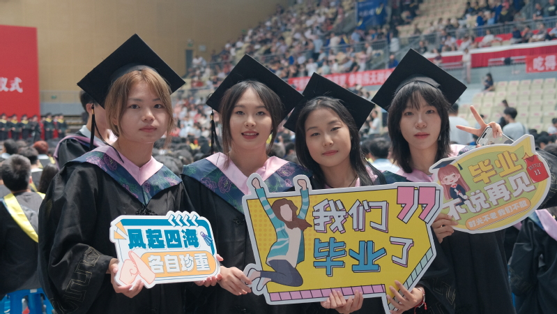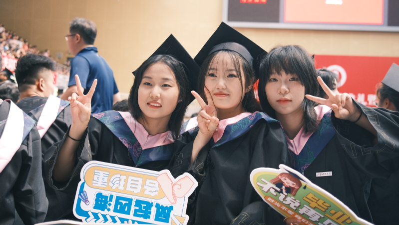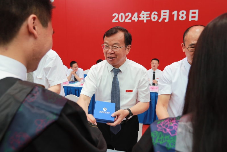 歡呼迭起,掌聲雷動。導師們身著導師服上臺站定,莊重的學位授予儀式正式開始。畢業生身穿學位服,依次上臺領取學位證書,學位委員會全體導師為他們撥穗正冠、頒發學位證書并合影留念,學位授予儀式圓滿完成。瑩瑩玉壺心,依依惜別情。臺下,畢業生們與摯友相攜、與父母相擁,合影留念,用相機定格美好的瞬間。