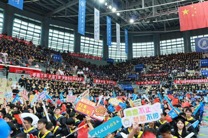 8點30分,在激昂雄壯的國歌聲中,畢業典禮盛大啟幕。主會場設鎮江大學城共享體育館,張家港校區設視頻分會場。學校在官方微信視頻號、B站、抖音、微博等平臺同步直播,師生校友“云端”相聚,共同見證青春榮光。