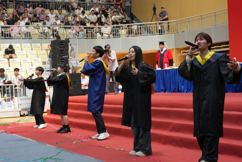 在書記的祝福中,萬千彩帶從天而降,將這閃耀的時刻裝點得更加繽紛絢爛。伴著掌聲,畢業典禮告一段落。中場休息時,大學生藝術團的同學們用充滿青春活力的歌聲表達了對畢業生的真摯祝愿。