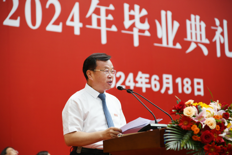 校黨委常委、副校長胡愛祥主持畢業典禮和學位授予儀式,代表學校向砥礪前行、滿載收獲的畢業生送上最誠摯的祝福,向傳道授業、培根鑄魂的老師們表達最崇高的敬意,向關心學校發展、支持學生成長成才的畢業生親友及社會各界人士,表示最衷心的感謝。