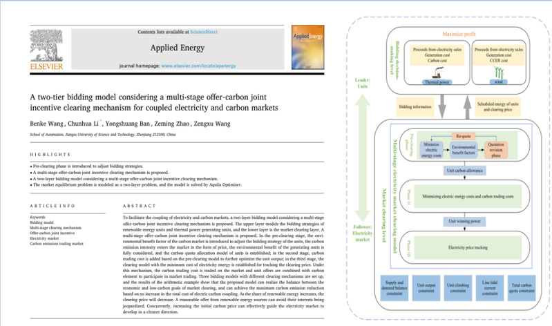 李春華副教授課題組在能源領(lǐng)域頂刊《Applied Energy》(中科院1區(qū)TOP期刊,影響因子11.2)上發(fā)表最新研究成果。提出基于多階段的兩層投標(biāo)模型,實現(xiàn)了報價-碳聯(lián)合激勵的電力市場清算機(jī)制,以促進(jìn)電-碳市場耦合。該投標(biāo)模型的上層對可再生能源機(jī)組與火電發(fā)電機(jī)組投標(biāo)策略建模,下層為電力市場出清層。研究結(jié)果表明,所提出的模型能夠?qū)崿F(xiàn)電力市場出清的經(jīng)濟(jì)目標(biāo)與低碳目標(biāo)之間的平衡,能夠在電-碳耦合總成本不增加的基礎(chǔ)上實現(xiàn)碳減排的最大化。