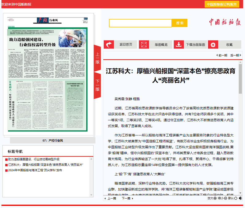 聚焦辦學特色,推進思政課程與課程思政同向同行。江蘇科大精心設計“精神引領+家國情懷+興船報國”系列思政課程,編制《中國大運河科技史》《大運河鎮江段文化史》等與船舶行業、地域特色相關的課程大綱,將行業特色資源、國防教育融入課程思政體系,培養學生“向海圖強、愛國報國”情懷。江蘇科大制作的《近現代船舶工業發展與中國崛起》作為國家在線開放課程,登錄中國大學慕課平臺;“精神的豐碑”主題慕課、“百年·初心”黨史人物系列微課登上學習強國江蘇平臺;景榮春黨支部愛國思政移動課堂獲評江蘇省“信仰公開課”示范課;學習強國、省教育廳網站多次推介該校課程思政實施成效。