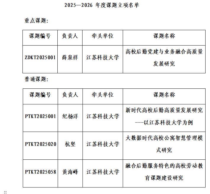 近日,江蘇省高等學校后勤協會公布了2025-2026年度課題立項結果,我校后勤管理處、后勤集團獲批1項重點課題、3項普通課題,立項數量名列省內高校前列,成績喜人!